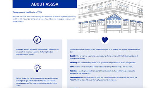In our new website, users will find a large number of new features as we provide a medical directory with better visualization and a more complete search, an advanced tool for calculating personalised quotations, and various communication channels to facilitate contact and keep up to date with your health care and our Company. We also present the advantages of our insurance, the history of ASSSA and different testimonies of our policyholders.